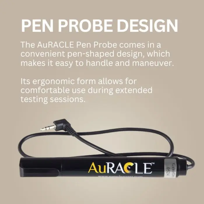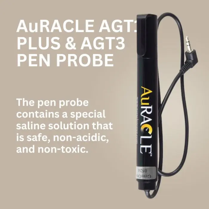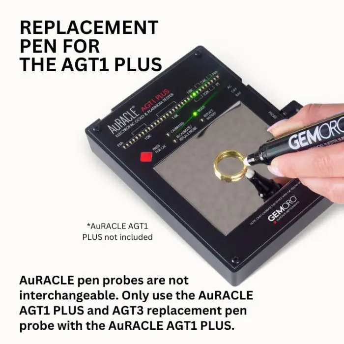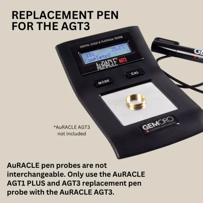 This replacement pen probe is specifically intended for operating the AuRACLE AGT1 PLUSand AuRACLE AGT3 Gold & Platinum Testers. Both the AuRACLE AGT1 PLUS and AuRACLE AGT3 each come with 1 pen probe included. The SILVER sticker easily identifies this replacement pen probe.