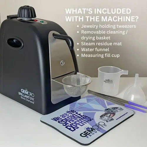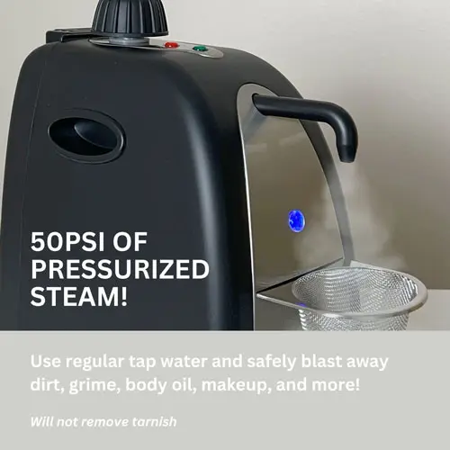 The ultimate personal jewelry steam cleaner with its increased steam pressure will thoroughly amaze you by effortlessly blasting away filth from the dirtiest of jewelry in just seconds, even in the tiniest of nooks and crannies of intricate pieces. With its larger tank and steam capacity, you may clean your entire collection of jewels and more with ease!