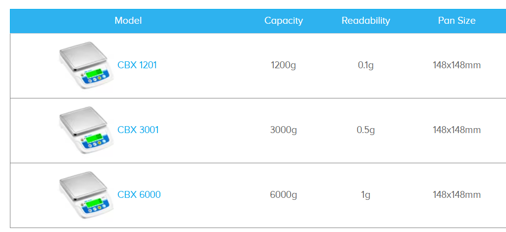Parts CountingThe built-in parts counting application with preset sample sizes is useful for taking inventory or bundling small parts during a manufacturing process. DisplayThe bright backlit display, which is easily visible from any viewing angle, can be used in any light conditions. Top Pan148x148mm grade 304 stainless steel removeable top pan allows swift cleaning. USB ChargingCharges and operates via low voltage USB input, providing flexibility for charging from sources like a computer, car or any other device with a USB-style input. Lightweight and PortableAll CBX balances are only 0.5kg making them lightweight and easy to carry between workstations. Adjustable FeetAdjustable feet ensure proper balance setup for optimum weighing results External CalibrationExternal calibration allows for verification and adjustment with weights. Calibration can be performed through keypad settings, making it easy to ensure accurate, precise weighing results. Simple operationEasy-to-use keypad features Mode/Units selectability, Parts Counting , Tare/Zero and power button. Other key operational features include a low battery indicator, level indicator, adjustable feet and an easy-to-use parts counting function.Features and Benefits