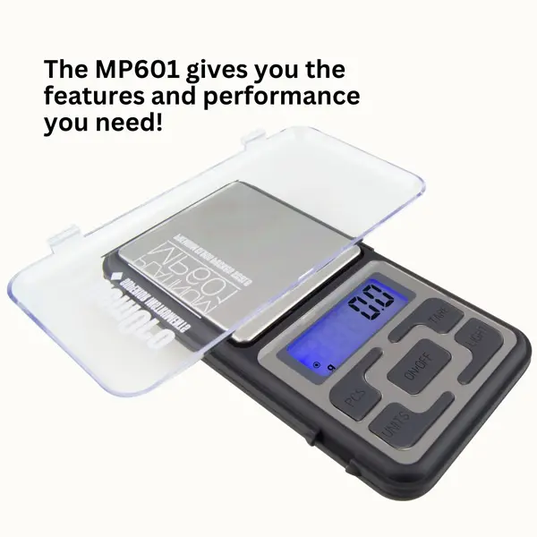The best way to describe the MP601 from GEMORO is with one word–cool! So you need a pocket scale, but can’t decide which one to choose? Look no further. This scale gives you the features and performance you would expect from a scale that costs twice the price. It features a clever detachable protective cover which when flipped upside down and placed on the scale creates a handy platform expansion tray that doubles the size of the stainless steel weighing platform!