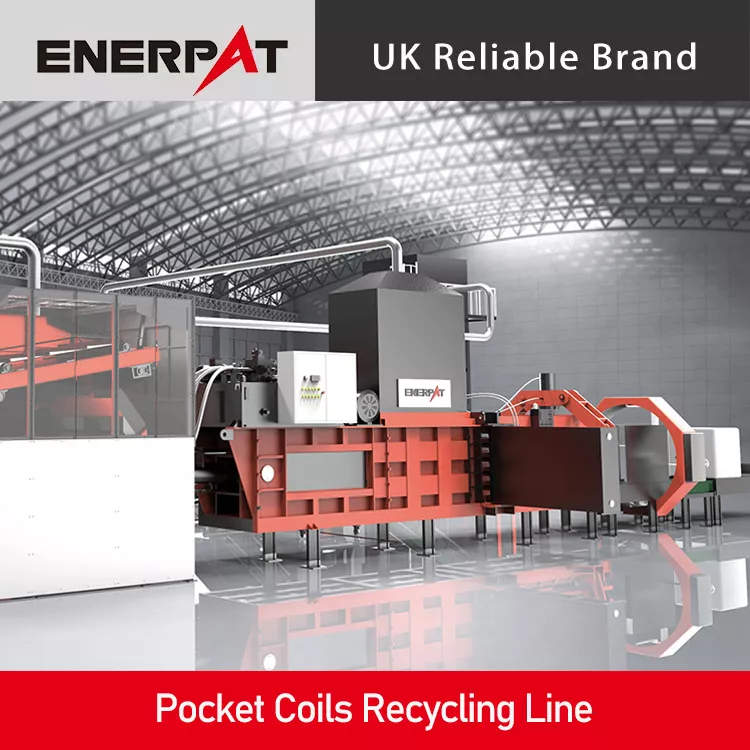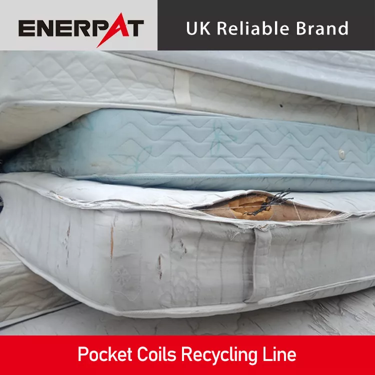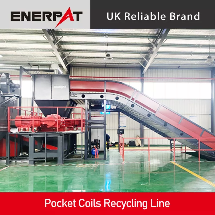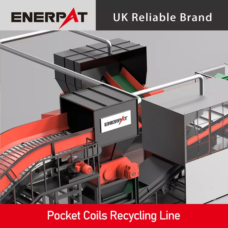 Pocket Coils Recycling Line The ENERPAT pocket spring recycling line relies on manual loading, which keeps daily operation simple while delivering high throughput. It cuts the environmental burden of used mattresses and squeezes the most value out of every part. We give customers a fast green and cost-smart way to handle pocket springs and push the circular economy forward. Rough shred Used mattresses travel on a rubber belt into a twin-shaft shredder that breaks them down to smaller than 50×800 mm, laying the groundwork for the next stages. Fine grind and wire pull The chips drop into a wire separator that mills them to under 80 mm while stripping spring steel from bits of cloth and foam. Magnetic pick up After fine size-reduction the mix runs under a magnetic separator that lifts out the spring steel along with a small amount of fabric and foam. Z sorter and clean up The stream then enters a Z sorter. A negative-pressure flow removes most remaining cloth and foam, leaving high-purity spring steel ready for reuse with full load-bearing strength.