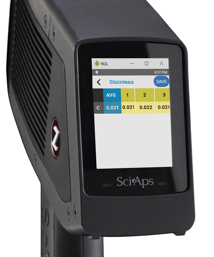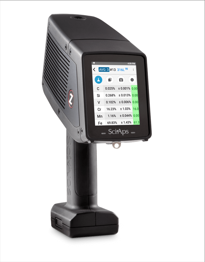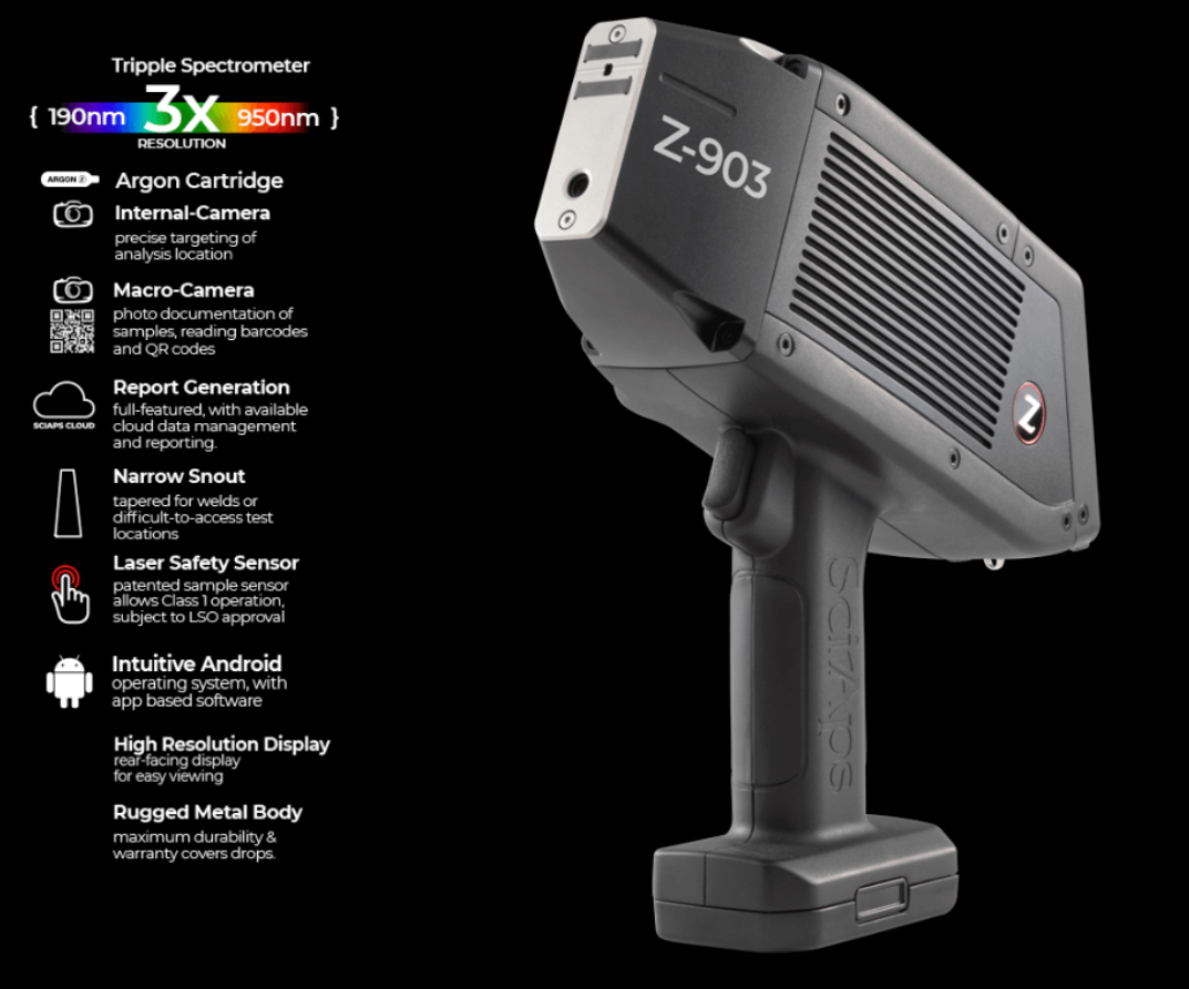 It uses the same powerful laser as SciAps other Z-900 models, but with an extended spectrometer range from 190 nm out to 950 nm.